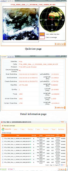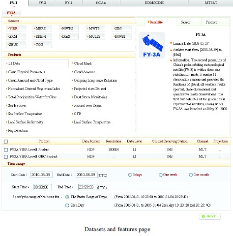 Click _Data_ at the top of the index page to start data surfing. First, find the satellite mission you are interested in. There are six satellite missions in the list: three Chinese satellite missions EFY-1, FY-2, FY-3F, two American missions ENOAA, EOS/MODISF, and one Japanese mission EMTSATF. Each mission contains the satellites, in or out-of operation, whose data have been archived in NSMC. Select your dataset and follow the guidance: satellite -> instrument ->product -> dataset-> time range (->space information), make sure the information you have entered is correct before clicking the _Next_ button.
