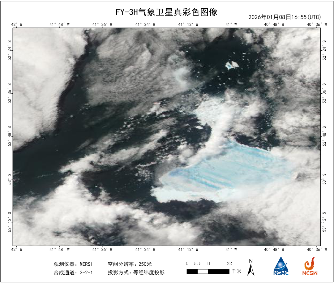 距离南乔治亚岛以西约250公里,南纬52.75°、西经41.34°的寒冷海域,一场持续近四十年的冰山演变历程,正在这里迎来尾声。1月14日,风云三号D星传回250米级分辨率的真彩色图像显示,曾经的世界最大冰山A23a主体面积仅余506平方公里,不足其最初规模的八分之一。而就在三周前,该冰山主体尚有9
